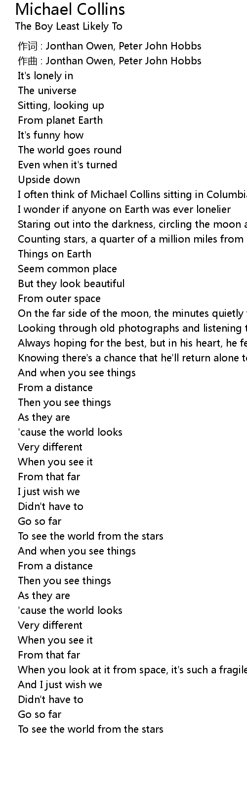 | [01:15.380] | Counting stars, a quarter of a million miles from home |