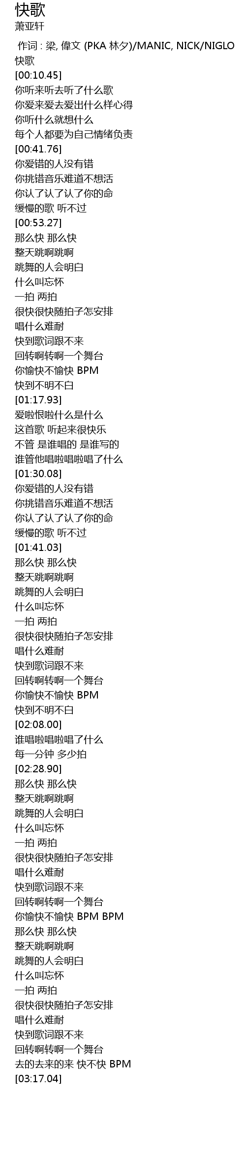 | [03:12.55] | qu de qu lai de lai kuai bu kuai BPM |