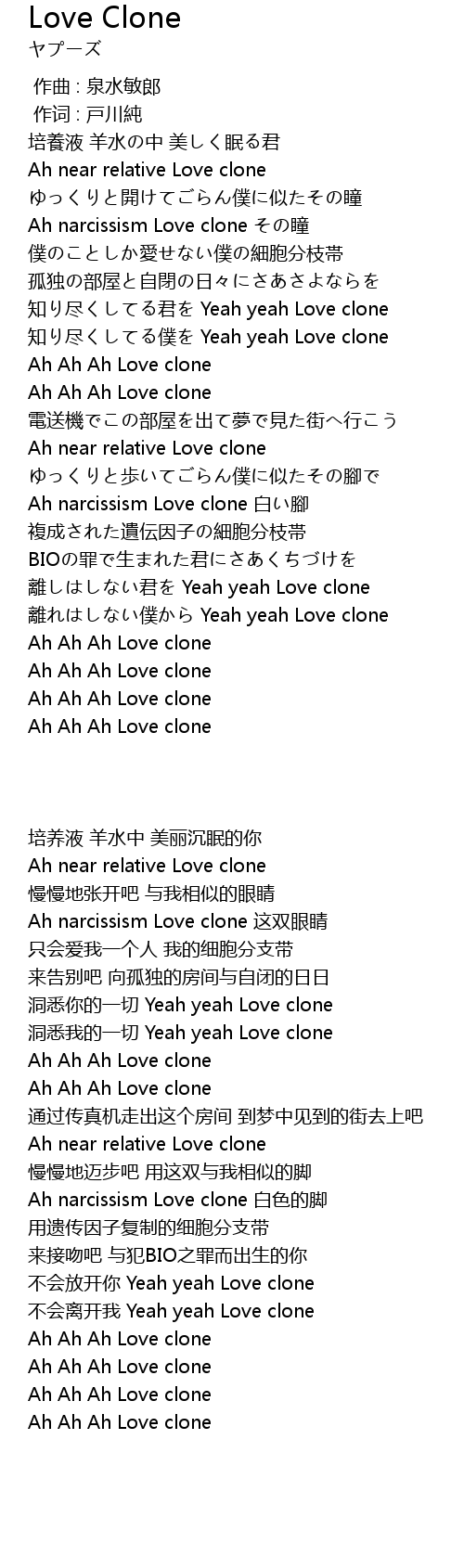 | [02:58.38] | 離れはしない僕から Yeah yeah Love clone |