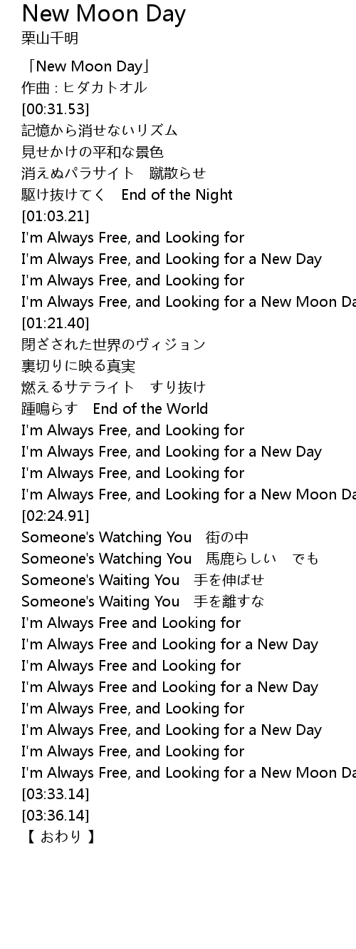 | [02:19.89] | I' m Always Free, and Looking for a New Moon Day |