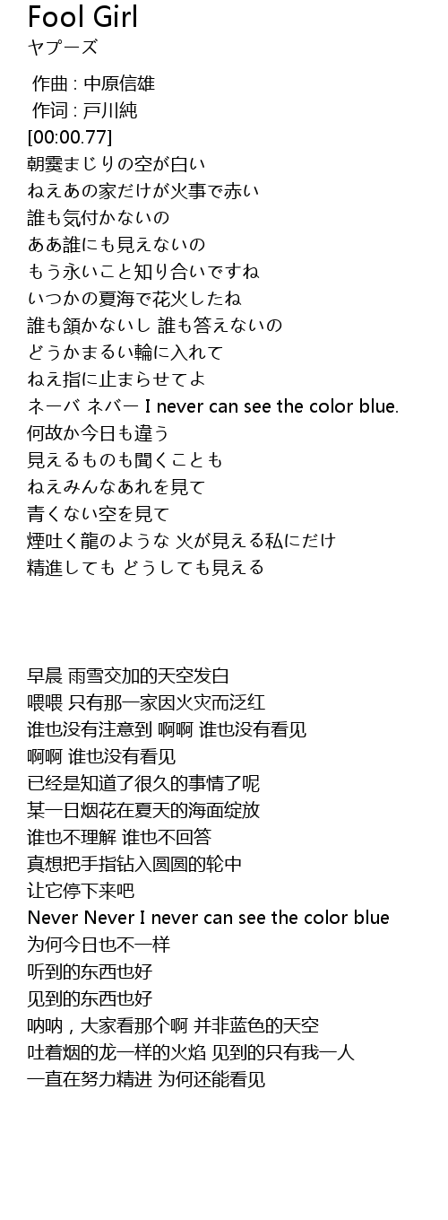 | [01:55.79] | ネーバ ネバー I never can see the color blue. |