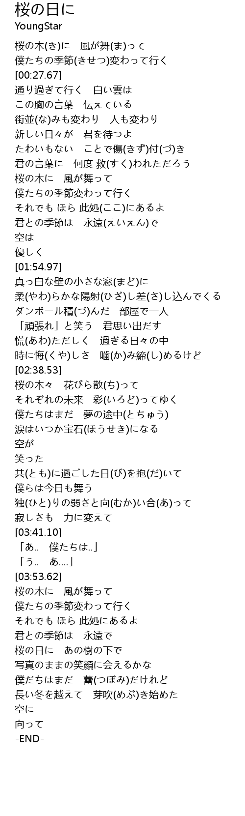| [02:41.22] | 桜の木々 花びら散(ち)って |