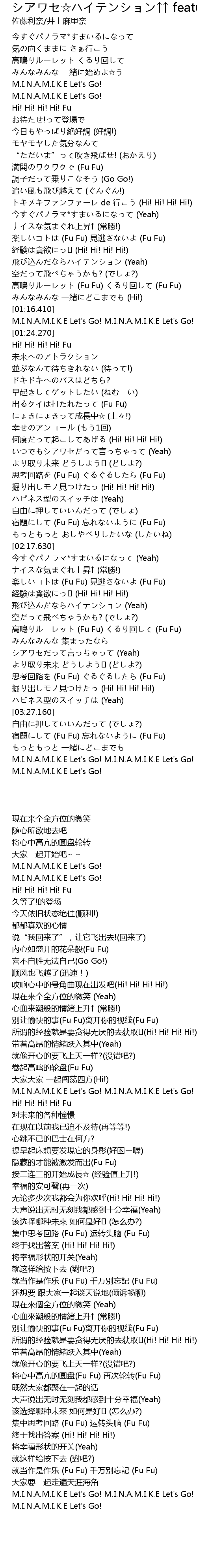 | [01:19.410] | M. I. N. A. M. I. K. E Let' s Go! M. I. N. A. M. I. K. E Let' s Go! |