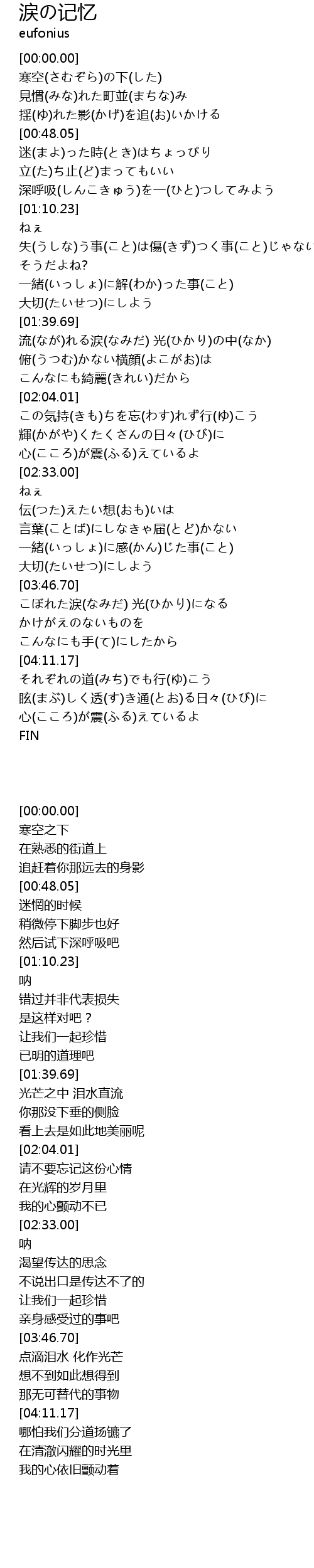 | [01:40.89] | 流(なが)れる涙(なみだ) 光(ひかり)の中(なか) |