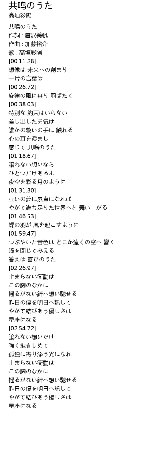 | [01:12.48] | 感じて 共鳴のうた |