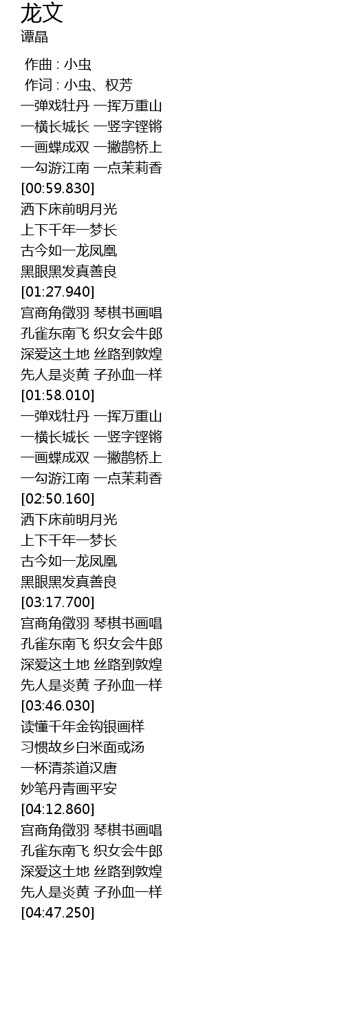 | [00:01.00] | 作词 : 小虫、权芳 |