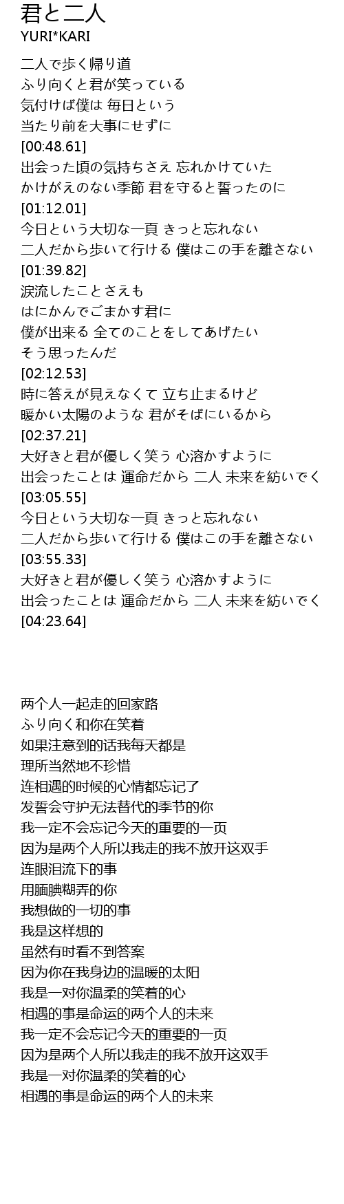 | [04:08.37] | 出会ったことは 運命だから 二人 未来を紡いでく |