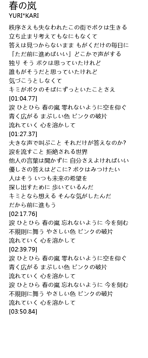 | [01:05.29] | 涙 ひとひら 春の嵐 零れないように空を仰ぐ |