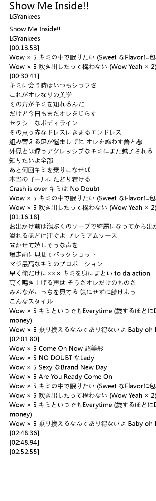 | [02:24.77] | Wow × 5 吹き出したって構わない (Wow Yeah × 2) |