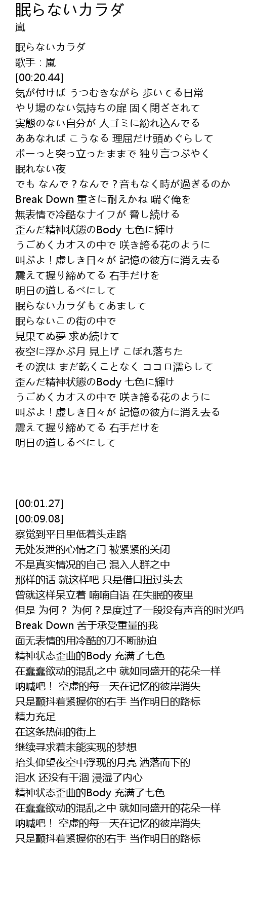 | [01:01.44] | Break Down 重さに耐えかね 喘ぐ俺を |