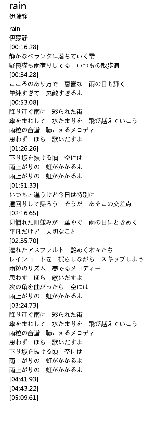 | [00:26.52] | 野良猫も雨宿りしてる いつもの散歩道 |