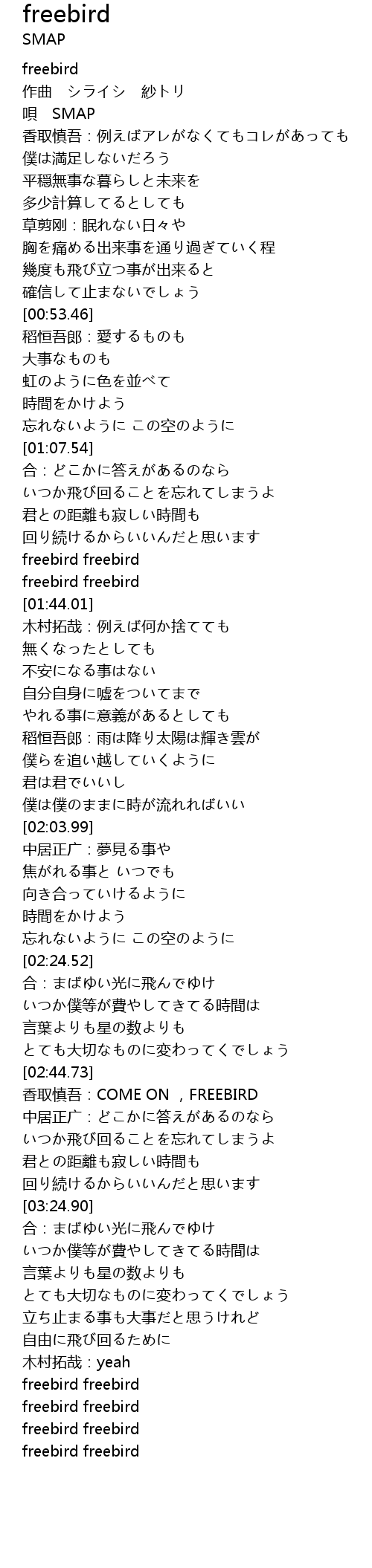 | [02:54.22] | 香取慎吾:COME ON ,FREEBIRD |