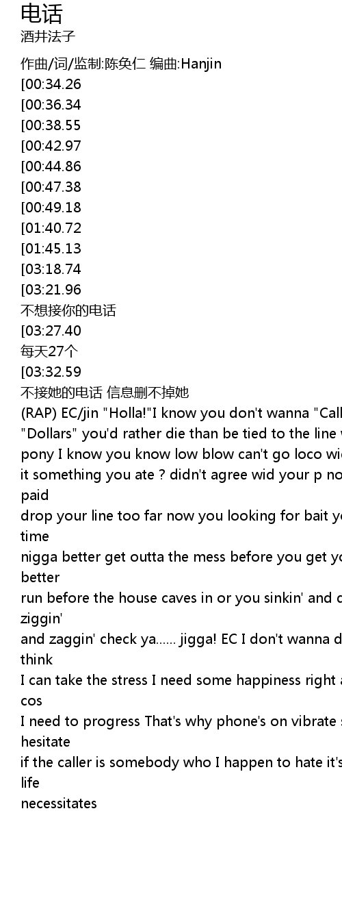 | [02:07.97] | RAP EC jin " Holla!" I know you don' t wanna " Call her !" for a million |