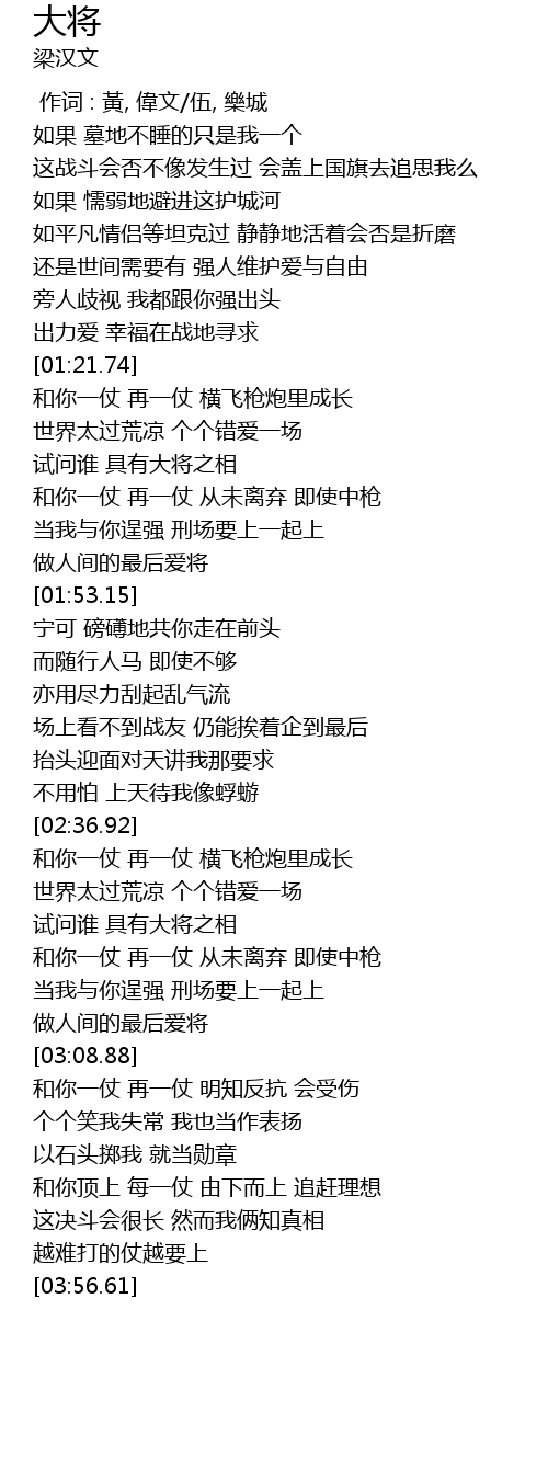 | [01:48.94] | 做人间的最后爱将 |