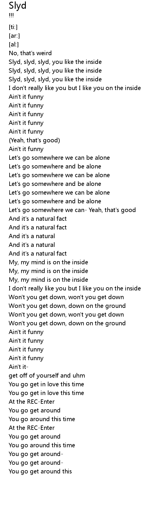 | [00:23.73] | Slyd, slyd, slyd, you like the inside |