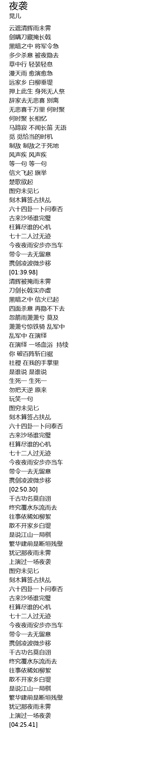 | [02:05.59] | 萧萧兮惊铁骑 乱军中 |