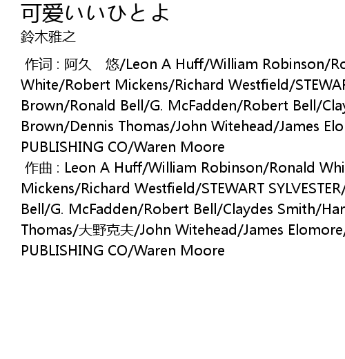| [00:00.000] | 作词 : 阿久 悠/Leon A Huff/William Robinson/Ronald White/Robert Mickens/Richard Westfield/STEWART SYLVESTER/Byrd Bobby/James Brown/Ronald Bell/G. McFadden/Robert Bell/Claydes Smith/Harry Casey/George Brown/Dennis Thomas/John Witehead/James Elomore/Van Mocoy/WERNER TAMERLANE PUBLISHING CO/Waren Moore |