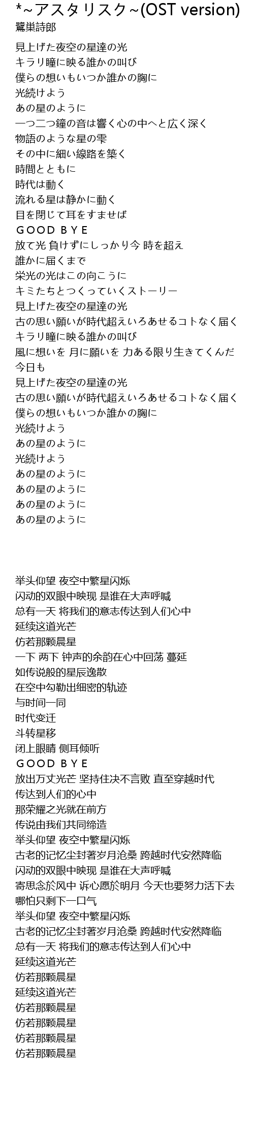 | [00:54.88] | 放て光 負けずにしっかり今 時を超え 誰かに届くまで |