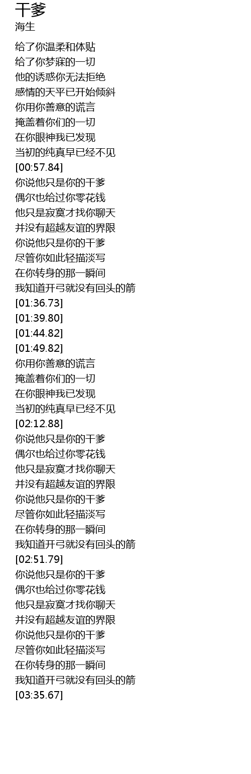 | [00:59.51] | nǐ shuō tā zhǐ shì nǐ de gān diē |