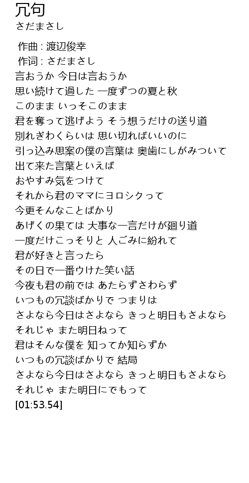 | [00:53.52] | あげくの果ては 大事な一言だけが廻り道 |