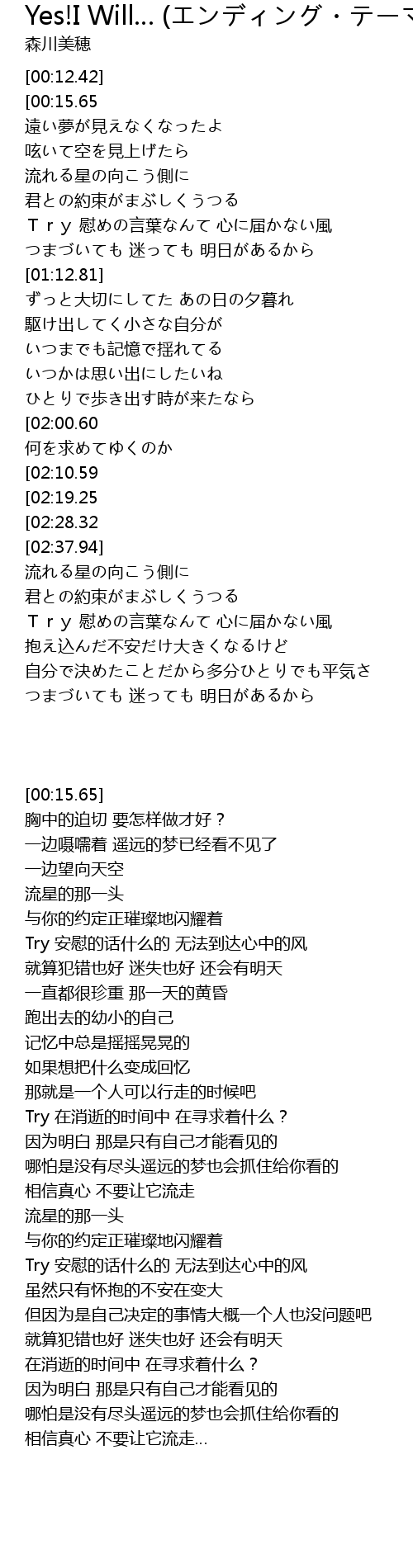 | [04:14.25][02:28.32] | 流されずにまっすぐな心を信じて |