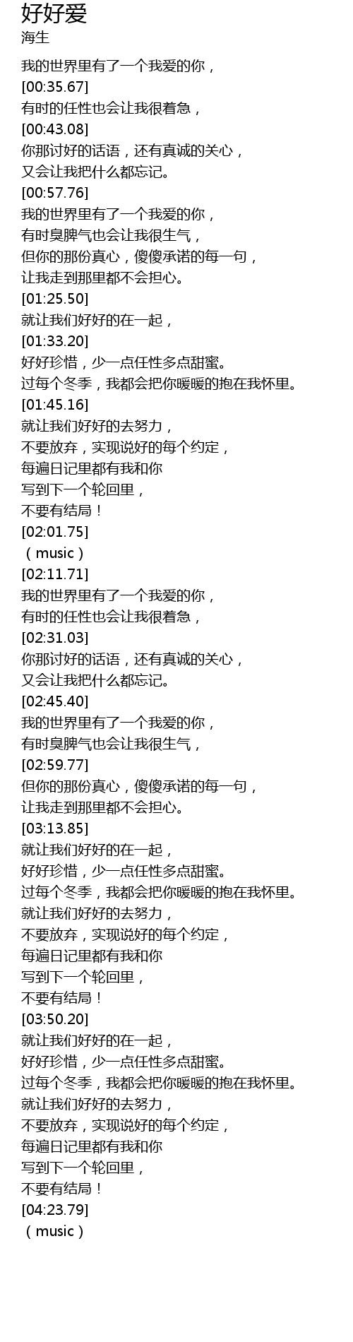 | [03:22.27] | 好好珍惜,少一点任性多点甜蜜。 |