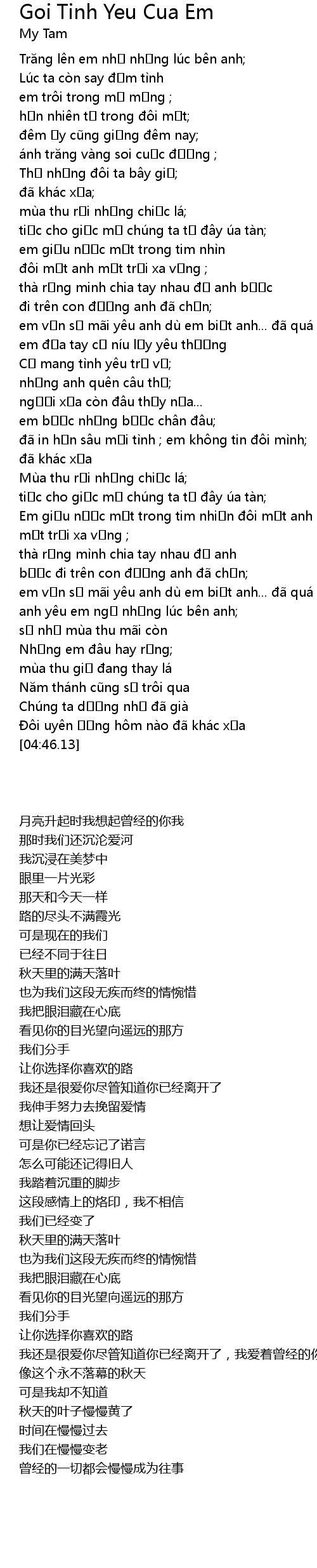 | [03:26.47] | em vẫn sẽ mãi yêu anh dù em biết anh... đã quá xa xôi; anh yêu em ngỡ những lúc bên anh; |