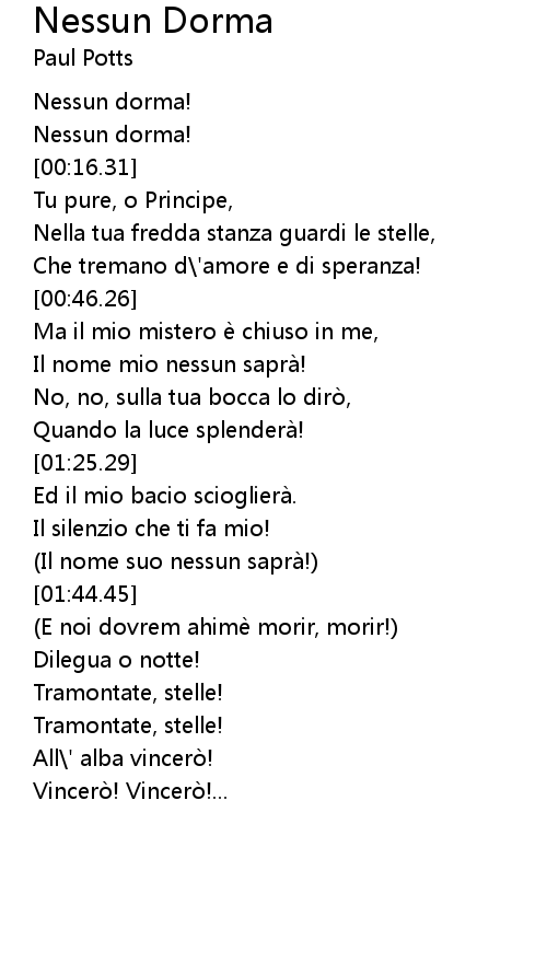 | [01:44.41] | Il nome suo nessun saprà! |