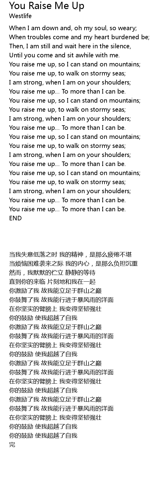 | [00:41.13] | You raise me up, so I can stand on mountains |