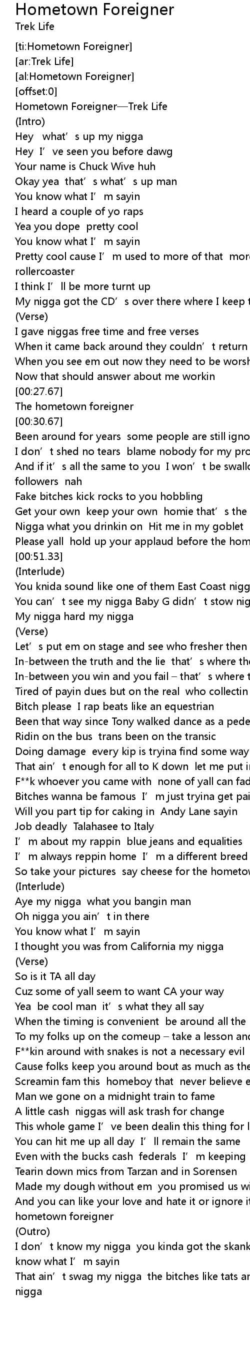 | [00:00.10] | Hometown Foreigner—Trek Life |