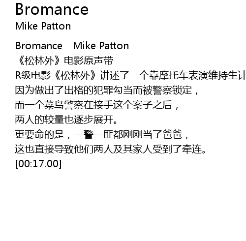 | [00:05.00] | R级电影《松林外》讲述了一个靠摩托车表演维持生计的痞子, |