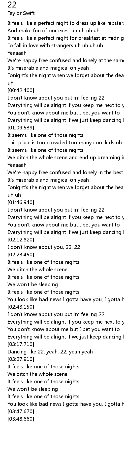 Everything will be alright if we just keep dancing like we're 22, 22 |