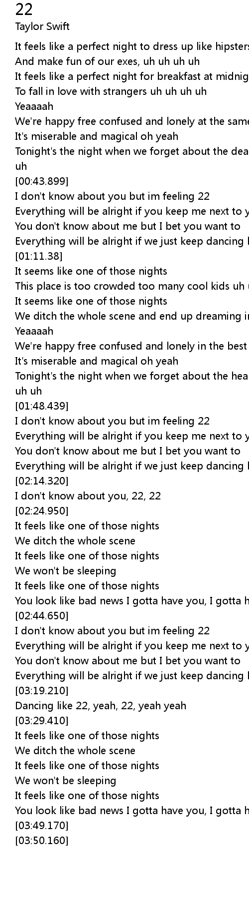Everything will be alright if we just keep dancing like we're 22, 22 |
