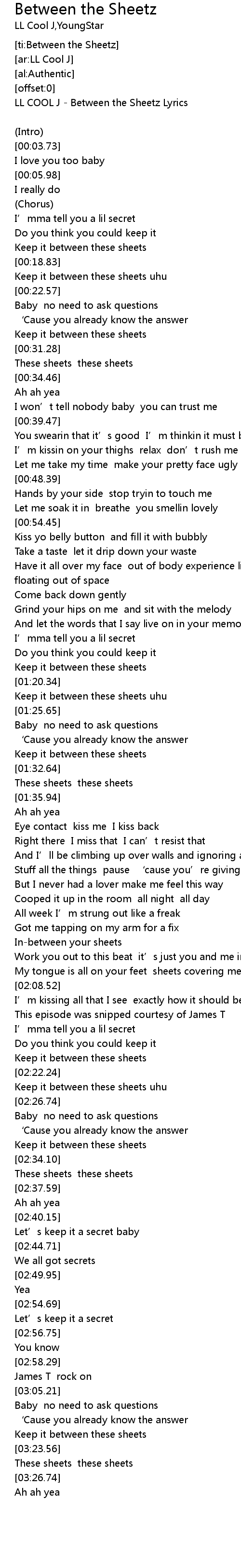 | [00:01.19] | LL COOL J - Between the Sheetz Lyrics |