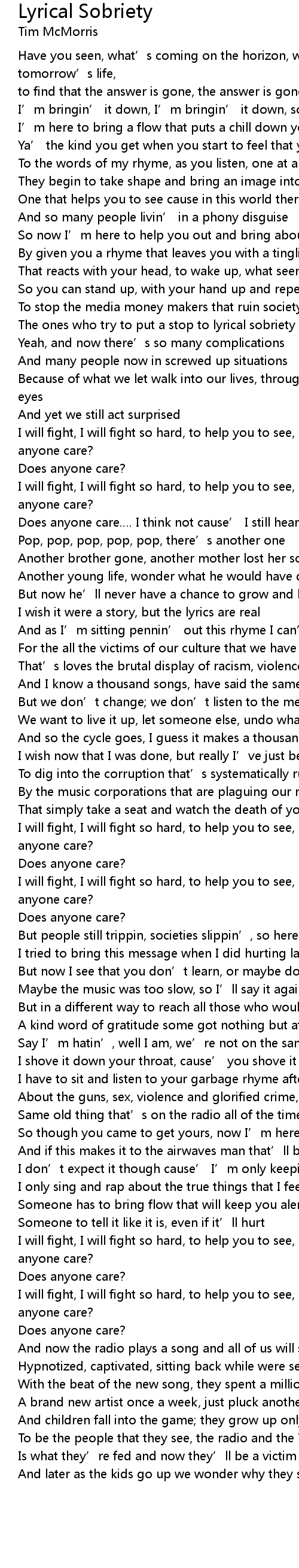 | [01:16.37] | Does anyone care…. I think not cause’ I still hear the guns go |
