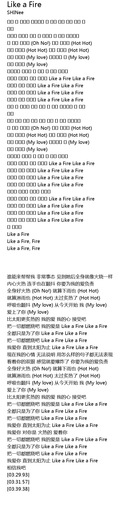 | [02:54.020] | 모조리 태울게 나의 사랑을 Like a Fire Like a Fire |