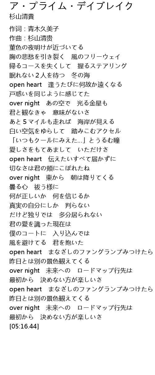 | [04:04.89] | open heart まなざしのファングランプみつけたら |
