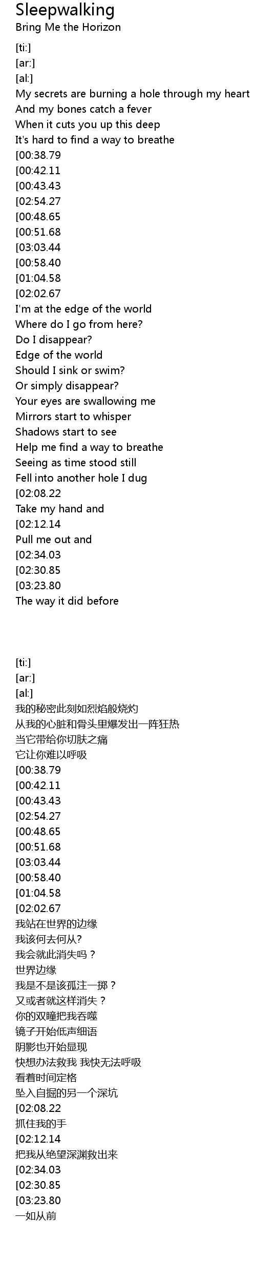 | [02:57.38][00:48.65] | Help me find a way to breathe |