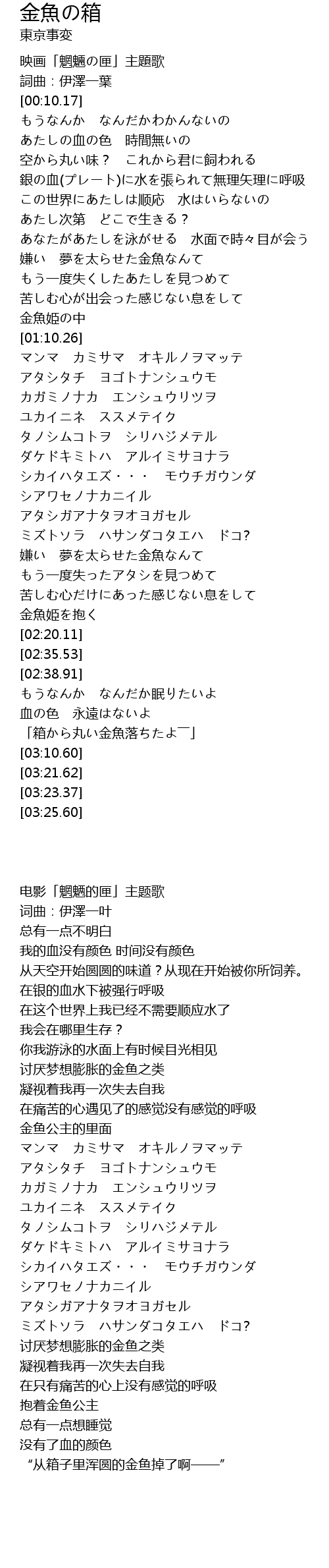 | [03:00.39] | 「箱から丸い金魚落ちたよ――」 |
