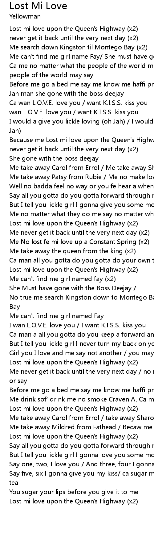 Because me Lost mi love upon the Queen's Highway (x2) |