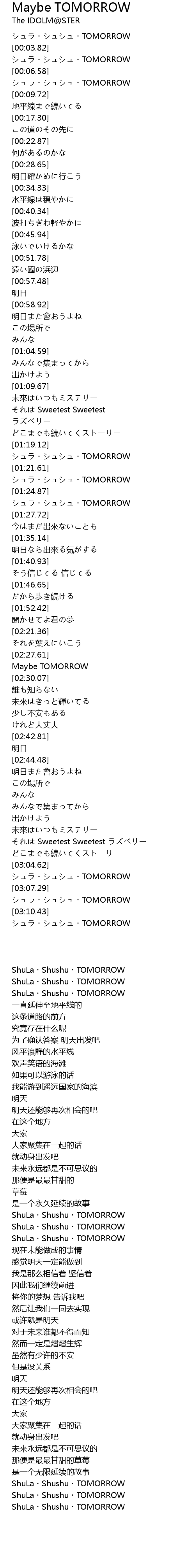| [03:10.99] | シュラ・シュシュ・TOMORROW |