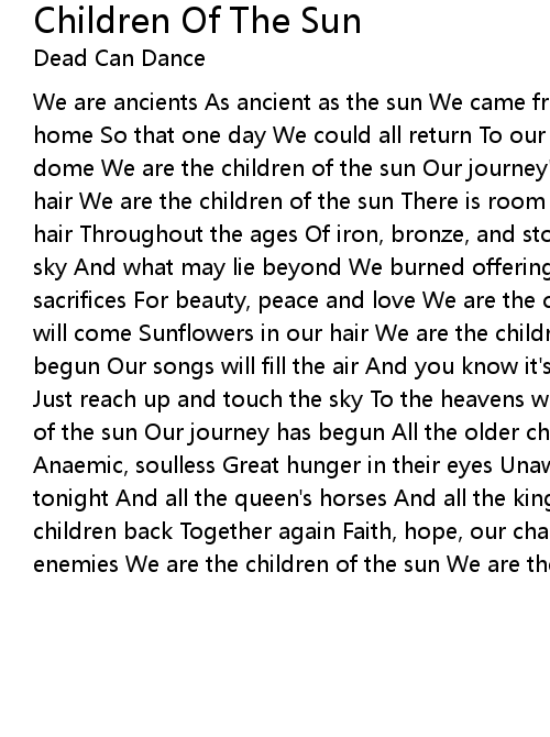 We are ancients As ancient as the sun We came from the ocean Once our ancestral home So that one day We could all return To our birthright The great celestial dome We are the children of the sun Our journey's just begun Sunflowers in our hair We are the children of the sun There is room for everyone Sunflowers in our hair Throughout the ages Of iron, bronze, and stone We marvelled at the night sky And what may lie beyond We burned offerings To the elemental ones Made sacrifices For beauty, peace and love We are the children of the sun Our kingdom will come Sunflowers in our hair We are the children of the sun Our carnival's begun Our songs will fill the air And you know it's time To look for reasons why Just reach up and touch the sky To the heavens we'll ascend We are the children of the sun Our journey has begun All the older children Come out at night Anaemic, soulless Great hunger in their eyes Unaware of the beauty That sleeps tonight And all the queen's horses And all the king's men Will never put these children back Together again Faith, hope, our charities Greed, sloth, our enemies We are the children of the sun We are the children of the sun |