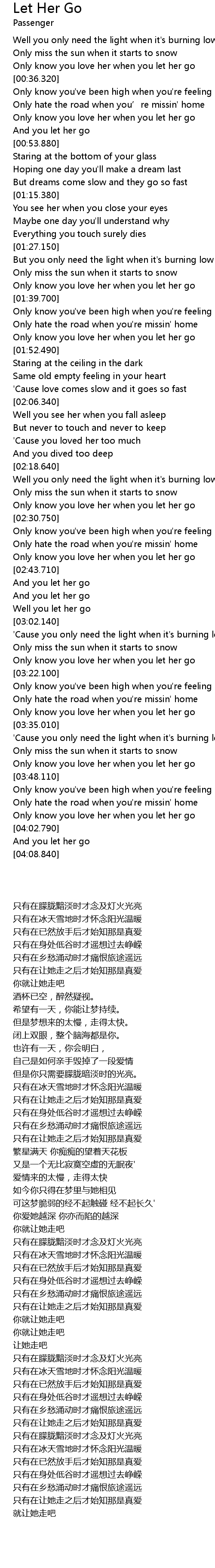 | [00:33.520] | Only know you love her when you let her go |