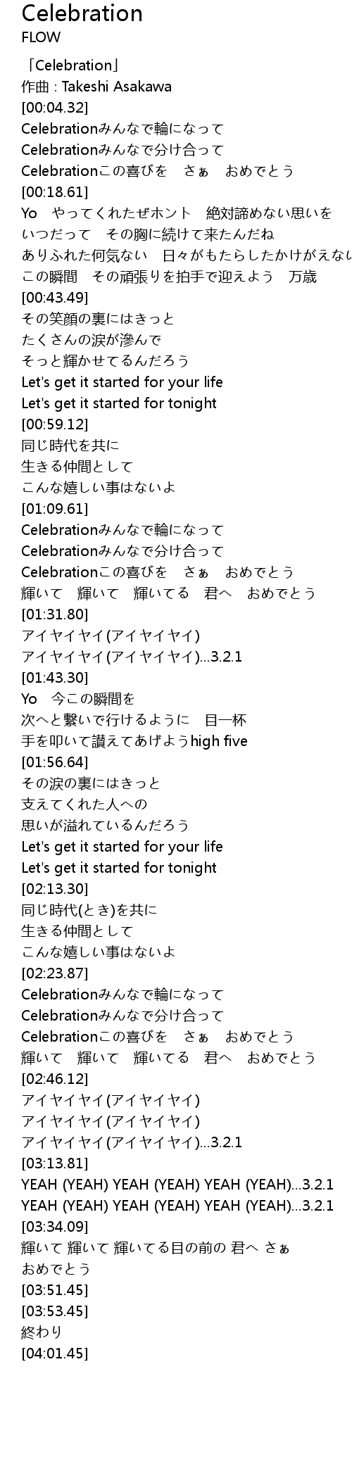 | [02:29.98] | Celebrationこの喜びを さぁ おめでとう |