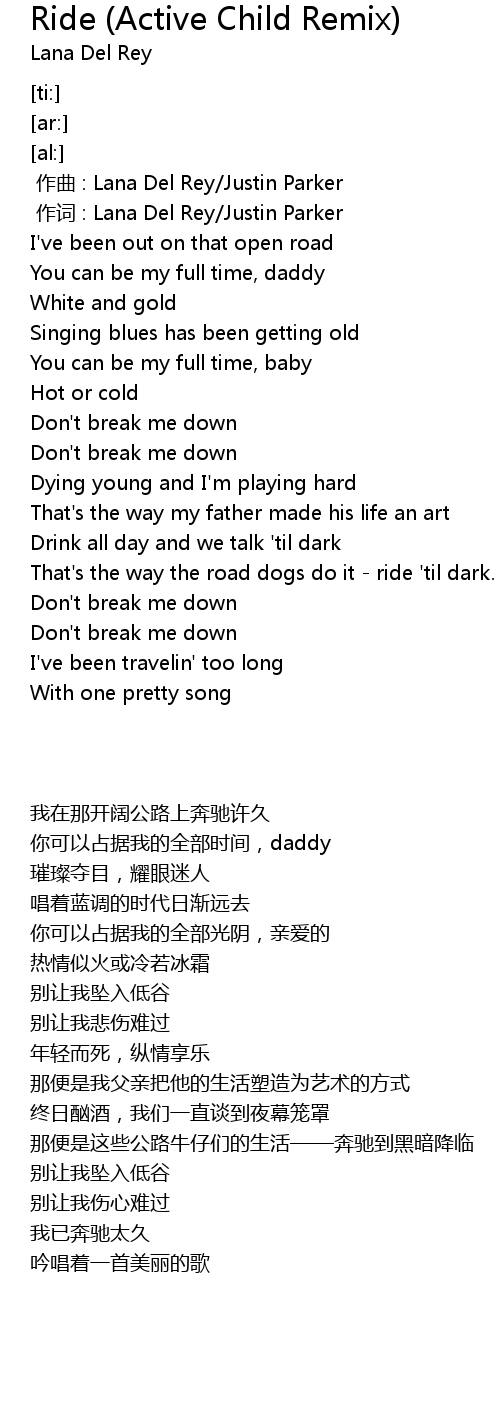| [00:01.00] | 作词 : Lana Del Rey/Justin Parker |