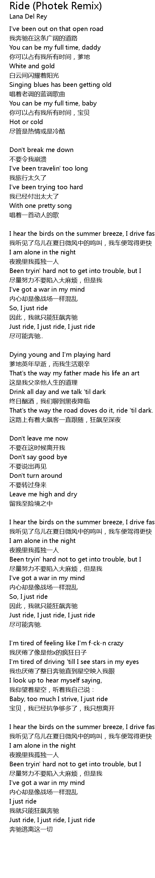 | Baby, too much I strive, I just ride | |