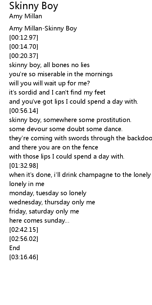 | [00:06.65] | Amy MillanSkinny Boy |
