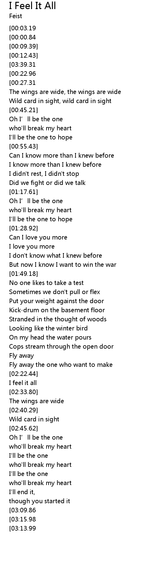 | [03:26.64][00:00.84] | Feist-I Feel It All |