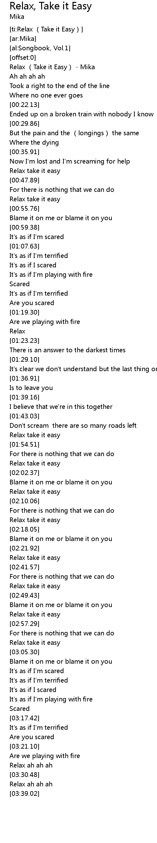 | [00:00.85] | Relax Take it Easy Mika |