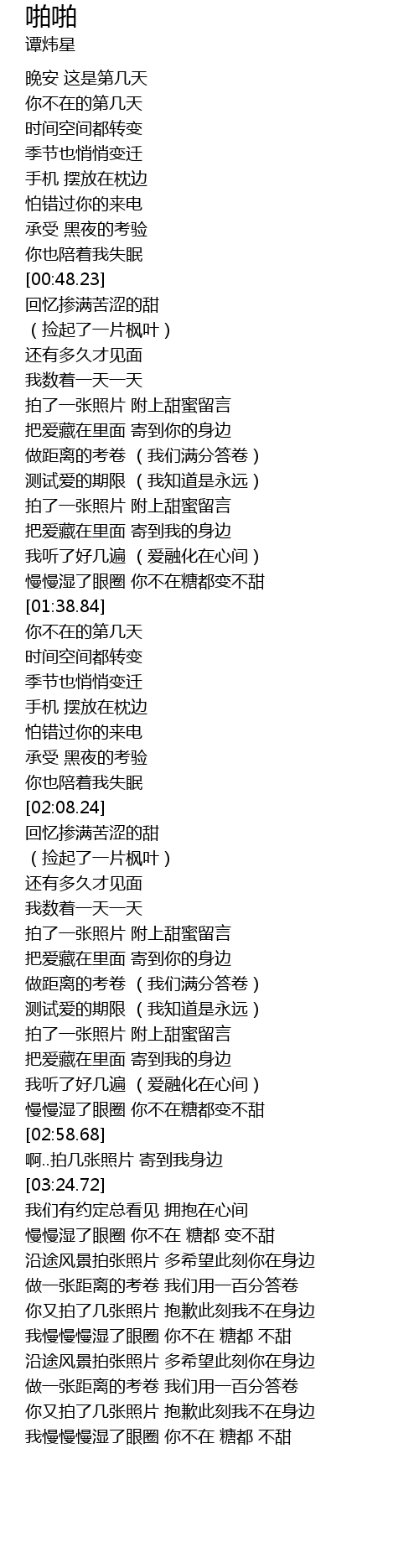 | [03:57.17] | 我慢慢慢湿了眼圈 你不在 糖都 不甜 |